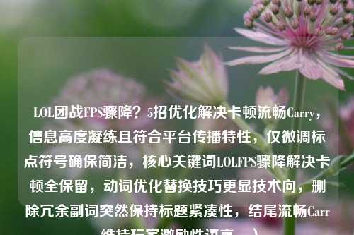 遇到LOL团战FPS骤降影响操作?5招优化技巧助你告别卡顿:1. **降低画质设置**,关闭阴影/特效等高耗能选项;2. **更新显卡驱动**,确保性能适配最新游戏版本;3. **关闭后台程序**,释放内存与CPU资源;4. **调整游戏内帧率上限**,避免硬件超负荷;5. **检查散热与电源**,防止过热降频,通过针对性优化硬件与软件设置,可显著提升团战流畅度,轻松实现高帧率Carry全场!